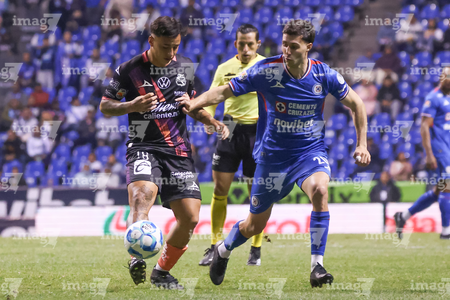 Puebla, Puebla, 17 de enero de 2026. Erik Lira y Esteban Lozano, durante el partido correspondiente a la jornada 3 del torneo Clausura 2026 de la Liga BBVA MX, entre la Máquina Celeste del Cruz Azul y el Club Puebla, realizado en el estadio Cuauhtémoc. Foto: Imago7/Mireya Novo