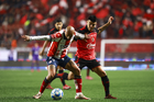 Tijuana, Baja California, 17 de enero de 2026. Mourad Daoudi y Robson Bambu, durante el partido correspondiente a la jornada 3 del torneo Clausura 2026 de la Liga BBVA MX, entre los Xolos de Tijuana y el Atlético de San Luis, realizado en el estadio Caliente. Foto: Imago7/Alejandro Gutiérrez Mora