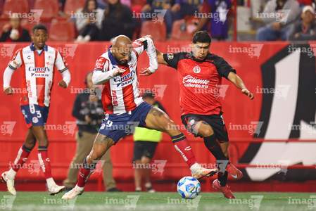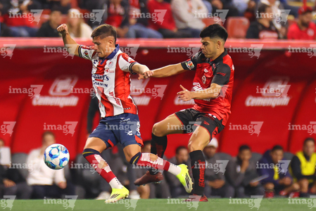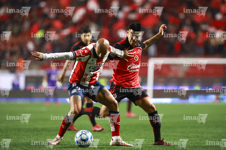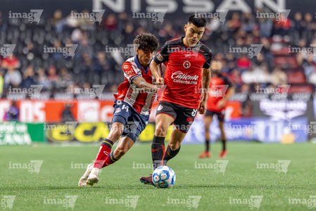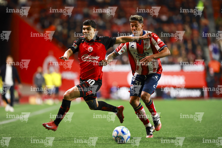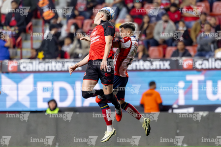 Tijuana, Baja California, 17 de enero de 2026. Miguel García e Iván Tona, durante el partido correspondiente a la jornada 3 del torneo Clausura 2026 de la Liga BBVA MX , entre los Xolos de Tijuana y el Atlético San Luis, realizado en el estadio Caliente. Foto: Imago7/ Hugo Martinez