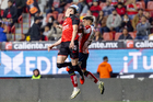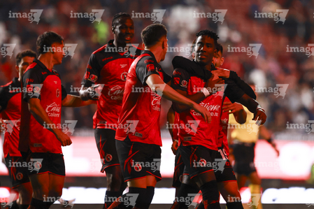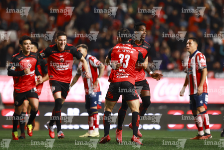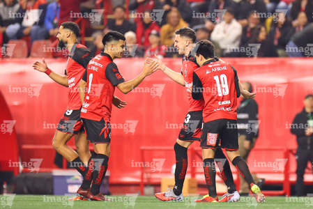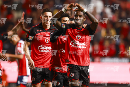 Tijuana, Baja California, 17 de enero de 2026. Iván Tona y Rafael Fernández en festejo de gol, durante el partido correspondiente a la jornada 3 del torneo Clausura 2026 de la Liga BBVA MX, entre los Xolos de Tijuana y el Atlético San Luis, realizado en el estadio Caliente. Foto: Imago7/ David Vega