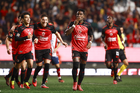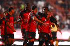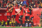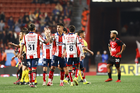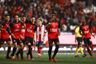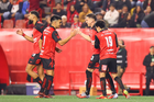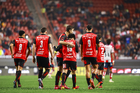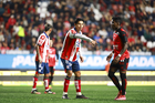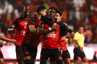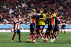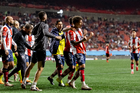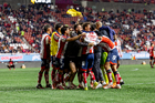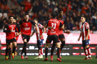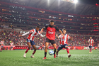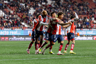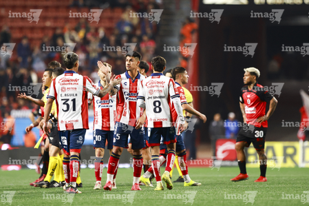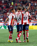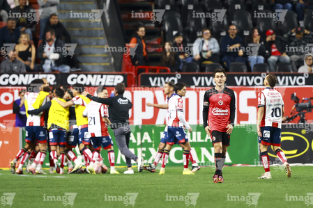 Tijuana, Baja California, 17 de enero de 2026. Jugadores del Atlético de San Luis en festejo, durante el partido correspondiente a la jornada 3 del torneo Clausura 2026 de la Liga BBVA MX, entre los Xolos de Tijuana y el Atlético de San Luis, realizado en el estadio Caliente. Foto: Imago7/Alejandro Gutiérrez Mora