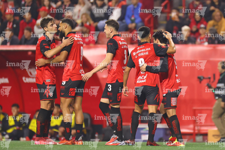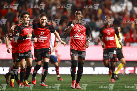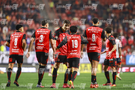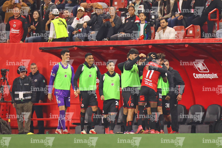 Tijuana, Baja California, 17 de enero de 2026. Jugadores de Xolos en festejo de gol, durante el partido correspondiente a la jornada 3 del torneo Clausura 2026 de la Liga BBVA MX, entre los Xolos de Tijuana y el Atlético de San Luis, realizado en el estadio Caliente. Foto: Imago7/Alejandro Gutiérrez Mora