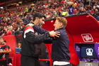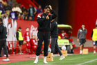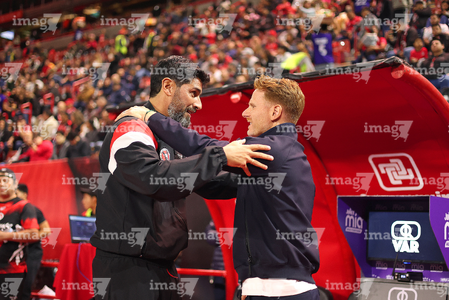 Tijuana, Baja California, 17 de enero de 2026. Sebastián "Loco" Abreu, director técnico y Guillermo Abascal, director técnico, durante el partido correspondiente a la jornada 3 del torneo Clausura 2026 de la Liga BBVA MX, entre los Xolos de Tijuana y el Atlético San Luis, realizado en el estadio Caliente. Foto: Imago7/ David Vega
