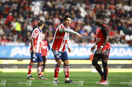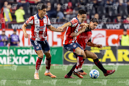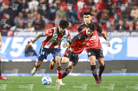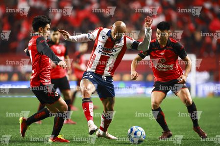 Tijuana, Baja California, 17 de enero de 2026. Oscar Macías (C), durante el partido correspondiente a la jornada 3 del torneo Clausura 2026 de la Liga BBVA MX , entre los Xolos de Tijuana y el Atlético San Luis, realizado en el estadio Caliente. Foto: Imago7/ Hugo Martinez