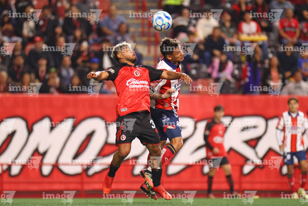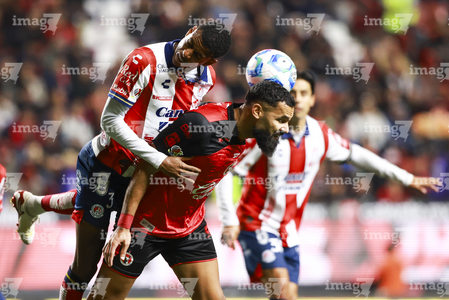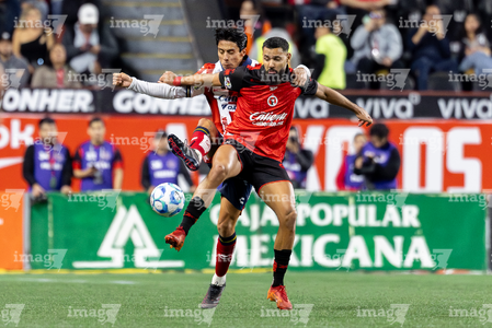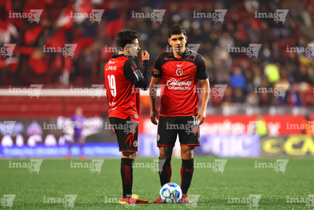 Tijuana, Baja California, 17 de enero de 2026. Rafael Fernández y Anderson Duarte, durante el partido correspondiente a la jornada 3 del torneo Clausura 2026 de la Liga BBVA MX , entre los Xolos de Tijuana y el Atlético San Luis, realizado en el estadio Caliente. Foto: Imago7/ Hugo Martinez