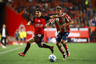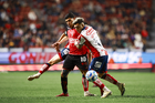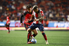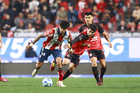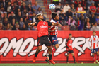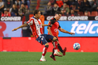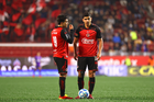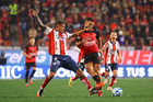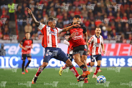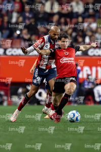 Tijuana, Baja California, 17 de enero de 2026. Josef Martínez y Eduardo Águila, durante el partido correspondiente a la jornada 3 del torneo Clausura 2026 de la Liga BBVA MX, entre los Xolos de Tijuana y el Atlético San Luis, realizado en el estadio Caliente. Foto: Imago7/ David Vega
