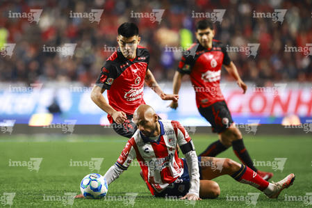 Tijuana, Baja California, 17 de enero de 2026. Benjamín Galindo y Mourad Daoudi, durante el partido correspondiente a la jornada 3 del torneo Clausura 2026 de la Liga BBVA MX, entre los Xolos de Tijuana y el Atlético San Luis, realizado en el estadio Caliente. Foto: Imago7/ David Vega