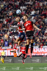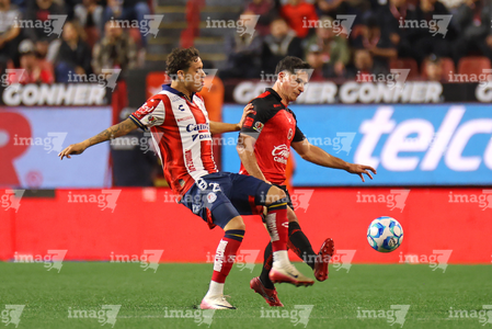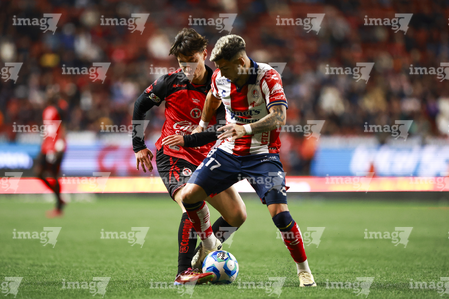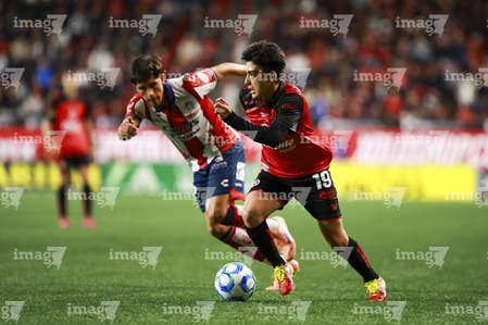 Tijuana, Baja California, 17 de enero de 2026. Benjamín Galdames e Iván Tona, durante el partido correspondiente a la jornada 3 del torneo Clausura 2026 de la Liga BBVA MX, entre los Xolos de Tijuana y el Atlético San Luis, realizado en el estadio Caliente. Foto: Imago7/ David Vega