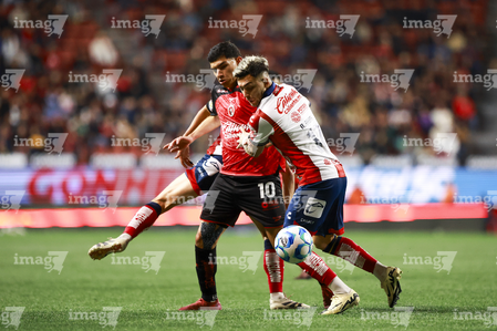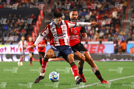 Tijuana, Baja California, 17 de enero de 2026. Kevin Castañeda y Eduardo Águila, durante el partido correspondiente a la jornada 3 del torneo Clausura 2026 de la Liga BBVA MX, entre los Xolos de Tijuana y el Atlético de San Luis, realizado en el estadio Caliente. Foto: Imago7/Alejandro Gutiérrez Mora
