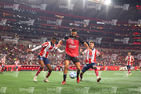 Tijuana, Baja California, 17 de enero de 2026. Gilberto Mora, Joao Geraldino e Iván Tona, durante el partido correspondiente a la jornada 3 del torneo Clausura 2026 de la Liga BBVA MX, entre los Xolos de Tijuana y el Atlético de San Luis, realizado en el estadio Caliente. Foto: Imago7/Alejandro Gutiérrez Mora