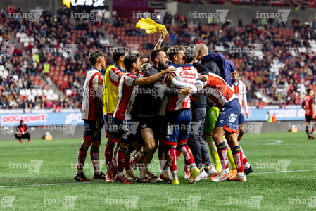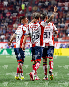 Tijuana, Baja California, 17 de enero de 2026. Jugadores de Atlético San Luis en festejo de gol, durante el partido correspondiente a la jornada 3 del torneo Clausura 2026 de la Liga BBVA MX , entre los Xolos de Tijuana y el Atlético San Luis, realizado en el estadio Caliente. Foto: Imago7/ Hugo Martinez
