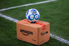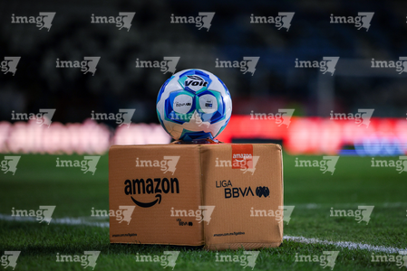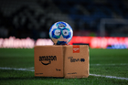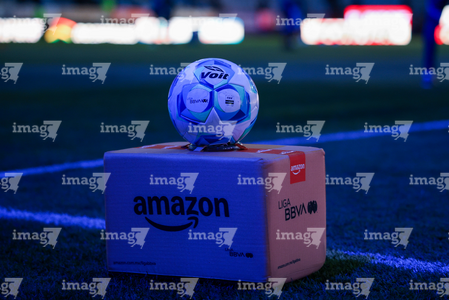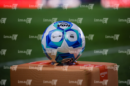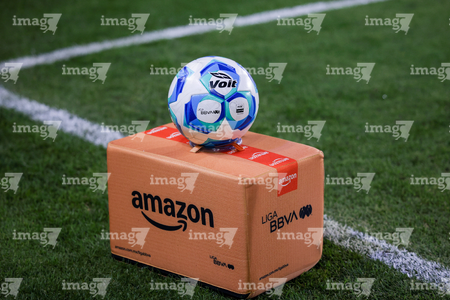 Pachuca, Hidalgo, 18 de enero de 2026. Balón de futbol Voit Aereus sobre caja de Amazon, durante el partido correspondiente a la jornada 3 del torneo Clausura 2026 de la Liga BBVA MX, entre los Tuzos del Pachuca y las Águilas del América, realizado en el estadio Hidalgo. Foto: Imago7/ Elizabeth Hernández