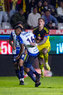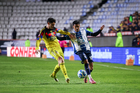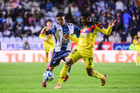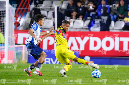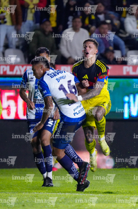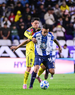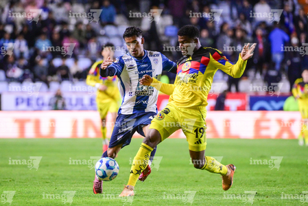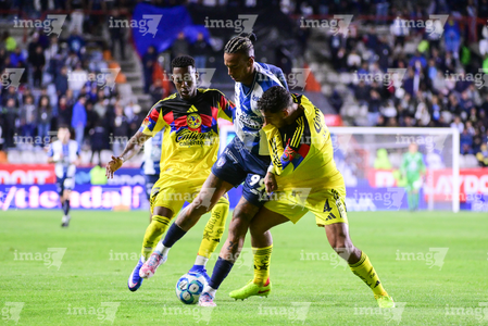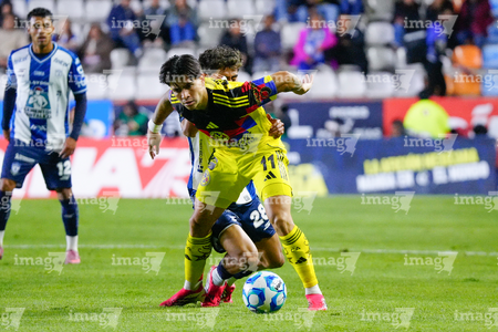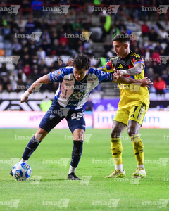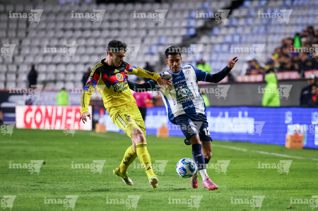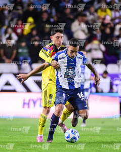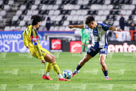 Pachuca, Hidalgo, 18 de enero de 2026. Alan Mozo y Brian Rodríguez, durante el partido correspondiente a la jornada 3 del torneo Clausura 2026 de la Liga BBVA MX, entre los Tuzos del Pachuca y las Águilas del América, realizado en el estadio Hidalgo. Foto: Imago7/ Alexis Chavez