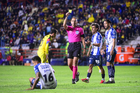 Pachuca, Hidalgo, 18 de enero de 2026. Luis Enrique Santander Aguirre, árbitro central, muestra tarjeta amarilla de amonestación, durante el partido correspondiente a la jornada 3 del torneo Clausura 2026 de la Liga BBVA MX, entre los Tuzos del Pachuca y las Águilas del América, realizado en el estadio Hidalgo. Foto: Imago7/ Alexis Chavez