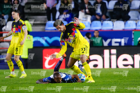 Pachuca, Hidalgo, 18 de enero de 2026. Christian Rivera y Álvaro Fidalgo, durante el partido correspondiente a la jornada 3 del torneo Clausura 2026 de la Liga BBVA MX, entre los Tuzos del Pachuca y las Águilas del América, realizado en el estadio Hidalgo. Foto: Imago7/ Alexis Chavez