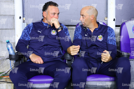 Mazatlán, Sinaloa, 6 de febrero de 2026. Gabriel Milito, director técnico y Leandro Ávila, durante el partido correspondiente a la jornada 5 del torneo Clausura 2026 de la Liga BBVA MX, entre los Cañoneros del Mazatlán FC y las Chivas Rayadas del Guadalajara, realizado en el estadio El Encanto. Foto: Imago7/ Juan Carlos Cubeyro.