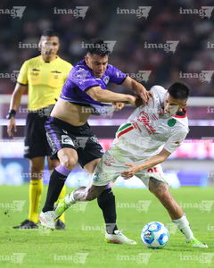 Mazatlán, Sinaloa, 6 de febrero de 2026. Facundo Almada y Roberto Alvarado "Piojo", durante el partido correspondiente a la jornada 5 del torneo Clausura 2026 de la Liga BBVA MX, entre los Cañoneros del Mazatlán FC y las Chivas Rayadas del Guadalajara, realizado en el estadio El Encanto. Foto: Imago7/ Juan Carlos Cubeyro.