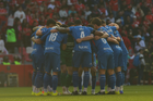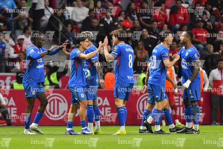 Toluca, Estado de México, 7 de febrero de 2026. Jugadores de Cruz Azul en festejo de gol, durante el partido correspondiente a la jornada 5 del torneo Clausura 2026 de la Liga BBVA MX, entre los Diablos Rojos del Toluca y la Máquina Celeste del Cruz Azul, realizado en el estadio Nemesio Diez. Foto: Imago7/ Arturo Hernández