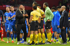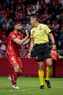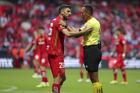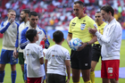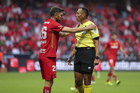 Toluca, Estado de México, 7 de febrero de 2026. Paulinho en reclamo a Luis Enrique Santander, árbitro central durante el partido correspondiente a la jornada 5 del torneo Clausura 2026 de la Liga BBVA MX, entre los Diablos Rojos del Toluca y la Máquina Celeste del Cruz Azul, realizado en el estadio Nemesio Diez. Foto: Imago7/ Rafael Vadillo