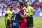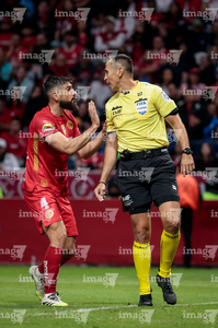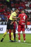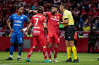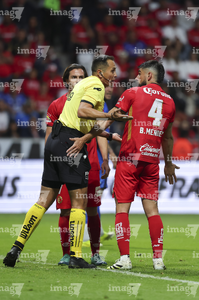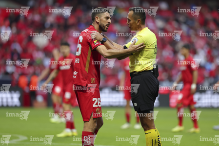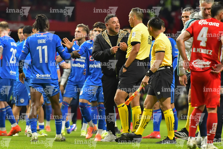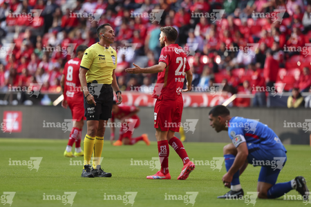 Toluca, Estado de México, 7 de febrero de 2026. Bruno Mendez en reclamo a Luis Enrique Santander, árbitro central, durante el partido correspondiente a la jornada 5 del torneo Clausura 2026 de la Liga BBVA MX, entre los Diablos Rojos del Toluca y la Máquina Celeste del Cruz Azul, realizado en el estadio Nemesio Diez. Foto: Imago7/Daniel Arriaga