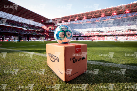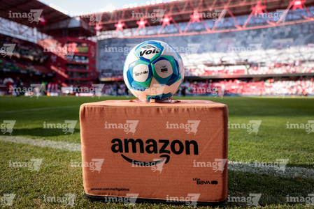 Toluca, Estado de México, 7 de febrero de 2026. Balón de futbol Voit Aereus sobre caja de Amazon, durante el partido correspondiente a la jornada 5 del torneo Clausura 2026 de la Liga BBVA MX, entre los Diablos Rojos del Toluca y la Máquina Celeste del Cruz Azul, realizado en el estadio Nemesio Diez. Foto: Imago7/ Arturo Hernández
