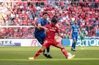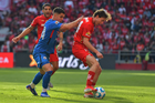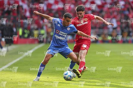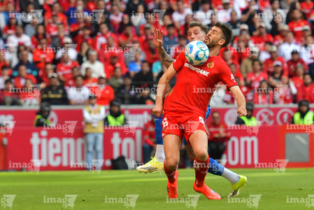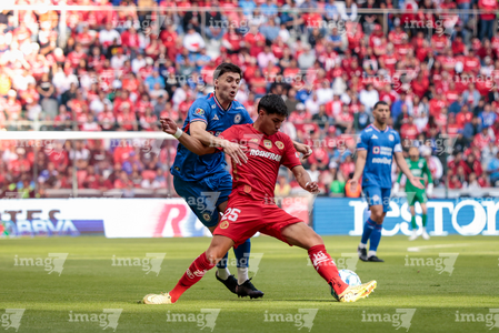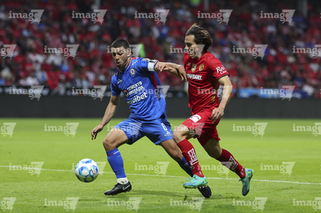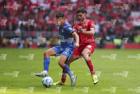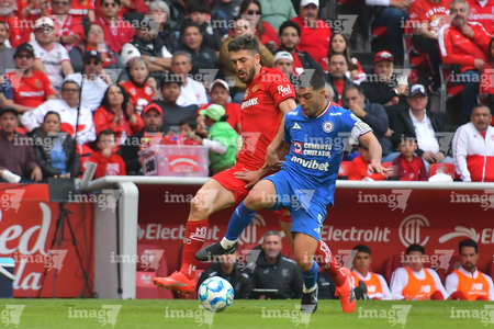 Toluca, Estado de México, 7 de febrero de 2026. Gonzalo Piovi y Jesús Angulo "Canelo", durante el partido correspondiente a la jornada 5 del torneo Clausura 2026 de la Liga BBVA MX, entre los Diablos Rojos del Toluca y la Máquina Celeste del Cruz Azul, realizado en el estadio Nemesio Diez. Foto: Imago7/Etzel Espinosa