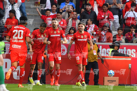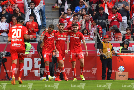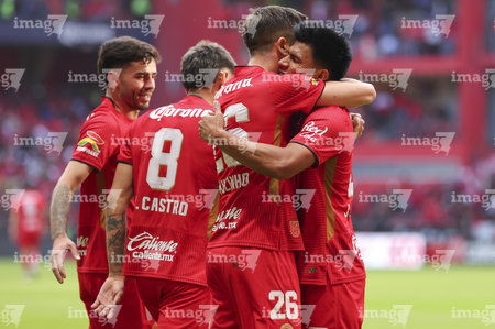 Toluca, Estado de México, 7 de febrero de 2026. Jugadores del Toluca en festejo de gol, durante el partido correspondiente a la jornada 5 del torneo Clausura 2026 de la Liga BBVA MX, entre los Diablos Rojos del Toluca y la Máquina Celeste del Cruz Azul, realizado en el estadio Nemesio Diez. Foto: Imago7/ Arturo Hernández