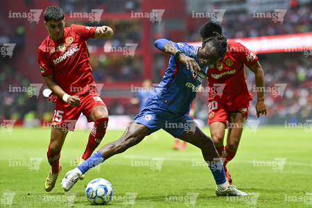 Toluca, Estado de México, 7 de febrero de 2026. Everardo López y Christian Ebere, durante el partido correspondiente a la jornada 5 del torneo Clausura 2026 de la Liga BBVA MX, entre los Diablos Rojos del Toluca y la Máquina Celeste del Cruz Azul, realizado en el estadio Nemesio Diez. Foto: Imago7/Etzel Espinosa