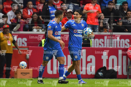 Toluca, Estado de México, 7 de febrero de 2026. Paulinho y Jesús Gallardoen festejo de gol, durante el partido correspondiente a la jornada 5 del torneo Clausura 2026 de la Liga BBVA MX, entre los Diablos Rojos del Toluca y la Máquina Celeste del Cruz Azul, realizado en el estadio Nemesio Diez. Foto: Imago7/ Rafael Vadillo