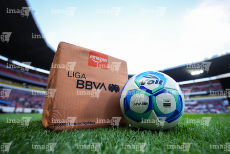 Guadalajara, Jalisco, 7 de febrero de 2026. Caja de Amazon y Balón de futbol Voit Aereus, durante el partido correspondiente a la jornada 5 del torneo Clausura 2026 de la Liga BBVA MX, entre los Rojinegros del Atlas y los Pumas de la UNAM, realizado en el estadio Jalisco. Foto: Imago7/ Hugo Ramirez
