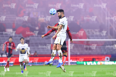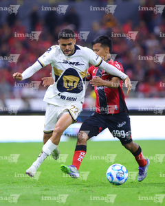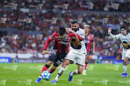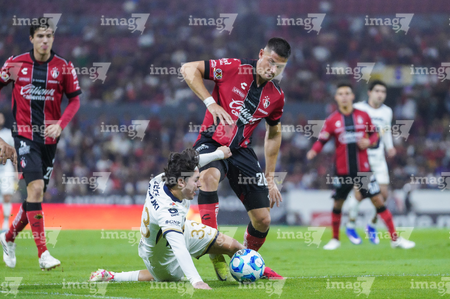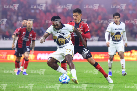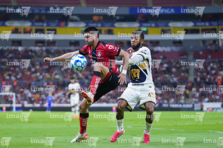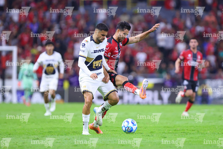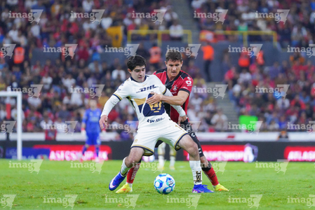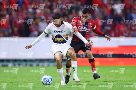 Guadalajara, Jalisco, 7 de febrero de 2026. Pedro Vite y Eduardo Aguirre, durante el partido correspondiente a la jornada 5 del torneo Clausura 2026 de la Liga BBVA MX, entre los Rojinegros del Atlas y los Pumas de la UNAM, realizado en el estadio Jalisco. Foto: Imago7/ Juan Carlos Cubeyro.