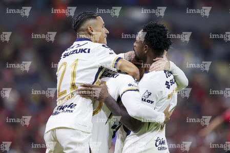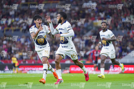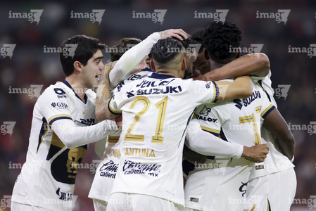 Guadalajara, Jalisco, 7 de febrero de 2026. Jugadores de Pumas en festejo de gol, durante el partido correspondiente a la jornada 5 del torneo Clausura 2026 de la Liga BBVA MX, entre los Rojinegros del Atlas y los Pumas de la UNAM, realizado en el estadio Jalisco. Foto: Imago7/ Jair Terán