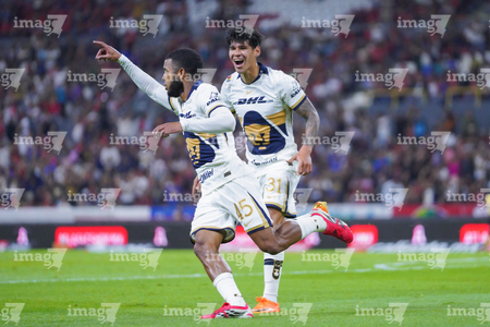 Guadalajara, Jalisco, 7 de febrero de 2026. Mateo García y Aldo Rocha en festejo de gol, durante el partido correspondiente a la jornada 5 del torneo Clausura 2026 de la Liga BBVA MX, entre los Rojinegros del Atlas y los Pumas de la UNAM, realizado en el estadio Jalisco. Foto: Imago7/Cristian Hernandez