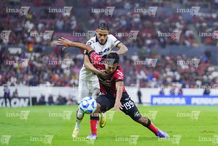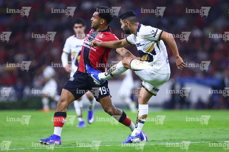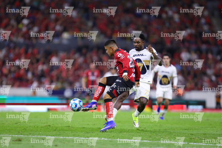 Guadalajara, Jalisco, 7 de febrero de 2026. Alan Medina y Gaddi Aguirre, durante el partido correspondiente a la jornada 5 del torneo Clausura 2026 de la Liga BBVA MX, entre los Rojinegros del Atlas y los Pumas de la UNAM, realizado en el estadio Jalisco. Foto: Imago7/ Juan Carlos Cubeyro.