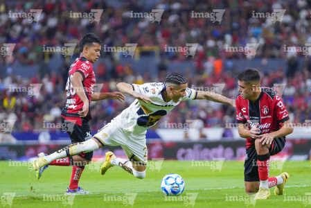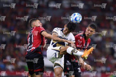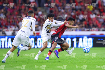 Guadalajara, Jalisco, 7 de febrero de 2026. Rodrigo Schlegel, Robert Morales y Manuel Capasso, durante el partido correspondiente a la jornada 5 del torneo Clausura 2026 de la Liga BBVA MX, entre los Rojinegros del Atlas y los Pumas de la UNAM, realizado en el estadio Jalisco. Foto: Imago7/Cristian Hernandez