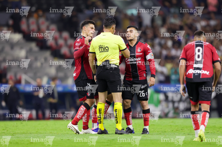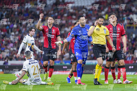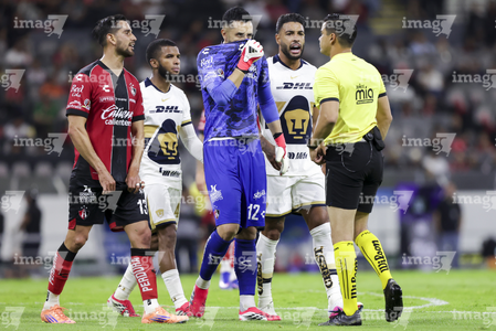 Guadalajara, Jalisco, 7 de febrero de 2026. Alfonso González y Aldo Rocha en reclamo a Jorge Abraham Camacho, árbitro central, durante el partido correspondiente a la jornada 5 del torneo Clausura 2026 de la Liga BBVA MX, entre los Rojinegros del Atlas y los Pumas de la UNAM, realizado en el estadio Jalisco. Foto: Imago7/ Jair Terán