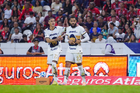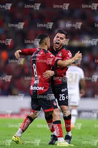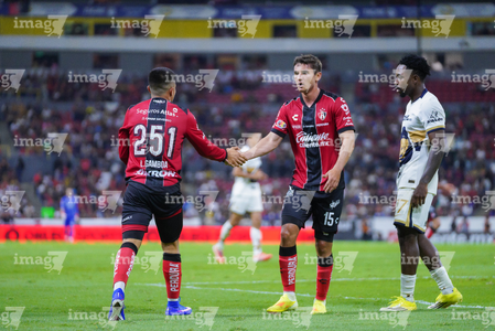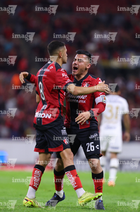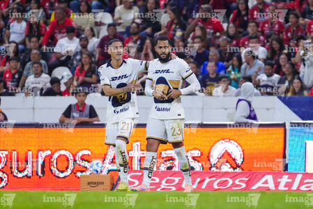Guadalajara, Jalisco, 7 de febrero de 2026. Luis Gamboa y Diego González en festejo, durante el partido correspondiente a la jornada 5 del torneo Clausura 2026 de la Liga BBVA MX, entre los Rojinegros del Atlas y los Pumas de la UNAM, realizado en el estadio Jalisco. Foto: Imago7/Cristian Hernandez