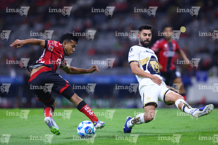 Guadalajara, Jalisco, 7 de febrero de 2026. Alvaro Angulo y Alfonso González, durante el partido correspondiente a la jornada 5 del torneo Clausura 2026 de la Liga BBVA MX, entre los Rojinegros del Atlas y los Pumas de la UNAM, realizado en el estadio Jalisco. Foto: Imago7/ Juan Carlos Cubeyro.