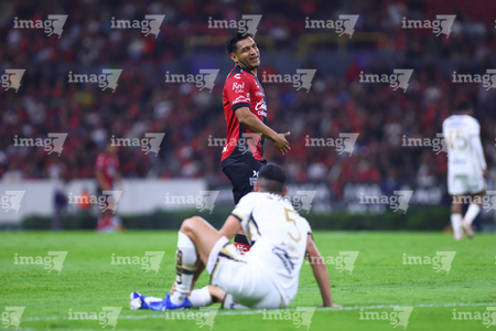 Guadalajara, Jalisco, 7 de febrero de 2026. Gaddi Aguirre y Uriel Antuna, durante el partido correspondiente a la jornada 5 del torneo Clausura 2026 de la Liga BBVA MX, entre los Rojinegros del Atlas y los Pumas de la UNAM, realizado en el estadio Jalisco. Foto: Imago7/ Hugo Ramirez