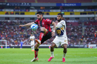 Guadalajara, Jalisco, 7 de febrero de 2026. Eduardo Aguirre y Rubén Duarte, durante el partido correspondiente a la jornada 5 del torneo Clausura 2026 de la Liga BBVA MX, entre los Rojinegros del Atlas y los Pumas de la UNAM, realizado en el estadio Jalisco. Foto: Imago7/ Juan Carlos Cubeyro.