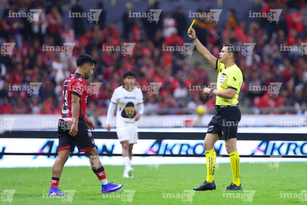 Guadalajara, Jalisco, 7 de febrero de 2026. Jorge Abraham Camacho, árbitro central muestra tarjeta amarilla de amonestación a Eduardo Aguirre, durante el partido correspondiente a la jornada 5 del torneo Clausura 2026 de la Liga BBVA MX, entre los Rojinegros del Atlas y los Pumas de la UNAM, realizado en el estadio Jalisco. Foto: Imago7/ Juan Carlos Cubeyro.
