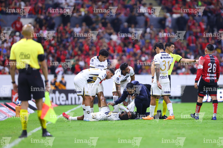 Guadalajara, Jalisco, 7 de febrero de 2026. resultó lesionado , durante el partido correspondiente a la jornada 5 del torneo Clausura 2026 de la Liga BBVA MX, entre los Rojinegros del Atlas y los Pumas de la UNAM, realizado en el estadio Jalisco. Foto: Imago7/Cristian Hernandez