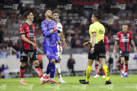 Guadalajara, Jalisco, 7 de febrero de 2026. Camilo Vargas en reclamo a Jorge Abraham Camacho, árbitro central, durante el partido correspondiente a la jornada 5 del torneo Clausura 2026 de la Liga BBVA MX, entre los Rojinegros del Atlas y los Pumas de la UNAM, realizado en el estadio Jalisco. Foto: Imago7/ Jair Terán