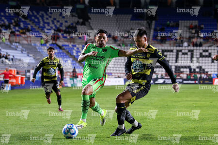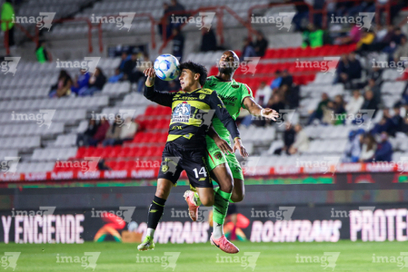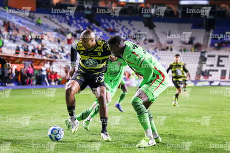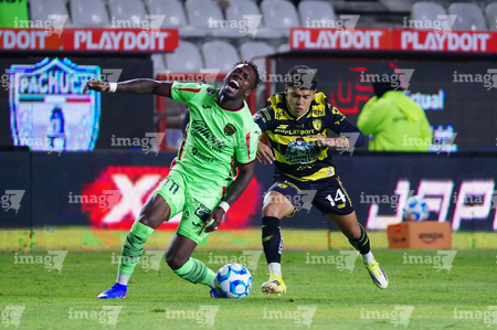 Pachuca, Hidalgo, 7 de febrero de 2026. Oscar Estupiñan y Sergio Barreto, durante el partido correspondiente a la jornada 5 del torneo Clausura 2026 de la Liga BBVA MX, entre los Tuzos del Pachuca y los Bravos de FC Juárez, realizado en el estadio Hidalgo. Foto: Imago7/ Jacqueline Pedraza