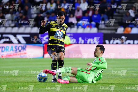 Pachuca, Hidalgo, 7 de febrero de 2026. Alán Bautista y Guilherme Castilho, durante el partido correspondiente a la jornada 5 del torneo Clausura 2026 de la Liga BBVA MX, entre los Tuzos del Pachuca y los Bravos de FC Juárez, realizado en el estadio Hidalgo. Foto: Imago7/ Elizabeth Hernández