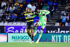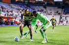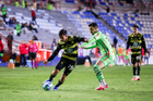 Pachuca, Hidalgo, 7 de febrero de 2026. Denzell García y Robert Kenedy, durante el partido correspondiente a la jornada 5 del torneo Clausura 2026 de la Liga BBVA MX, entre los Tuzos del Pachuca y los Bravos de FC Juárez, realizado en el estadio Hidalgo. Foto: Imago7/ Elizabeth Hernández