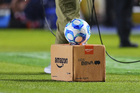 Ciudad de México, 7 de febrero de 2026. Balón de futbol Voit Aereus sobre caja de Amazon, durante el partido correspondiente a la jornada 5 del torneo Clausura 2026 de la Liga BBVA MX, entre las Águilas del América y los Rayados del Monterrey, realizado en el estadio Ciudad de los Deportes. Foto: Imago7/ Manlio Contreras