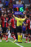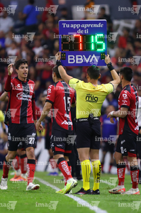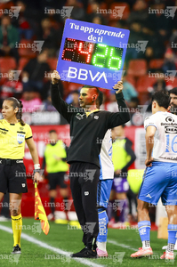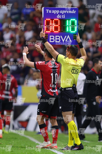 Guadalajara, Jalisco, 7 de febrero de 2026. Jesús Enrique Herrera, cuarto árbitro, con el tablero electrónico de cambios, durante el partido correspondiente a la jornada 5 del torneo Clausura 2026 de la Liga BBVA MX, entre los Rojinegros del Atlas y los Pumas de la UNAM, realizado en el estadio Jalisco. Foto: Imago7/Cristian Hernandez