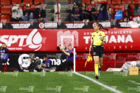 Tijuana, Baja California, 6 de febrero de 2026. Enedina Caudillo, árbitra asistente, durante el partido correspondiente a la jornada 5 del torneo Clausura 2026 de la Liga BBVA MX, entre los Xolos de Tijuana y el Club Puebla, realizado en el estadio Caliente. Foto: Imago7/ David Vega