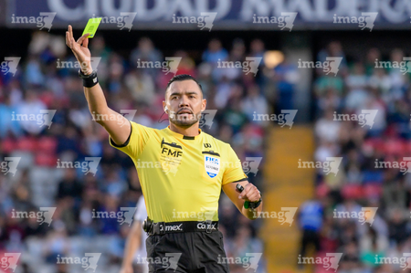 Querétaro, Querétaro, 7 de febrero de 2026. Marco Antonio Ortiz, árbitro central muestra tarjeta amarilla de amonestación, durante el partido correspondiente a la jornada 5 del torneo Clausura 2026 de la Liga BBVA MX, entre los Gallos Blancos del Querétaro y los Esmeraldas del León, realizado en el estadio La Corregidora. Foto: Imago7/ Duilio Muñoz